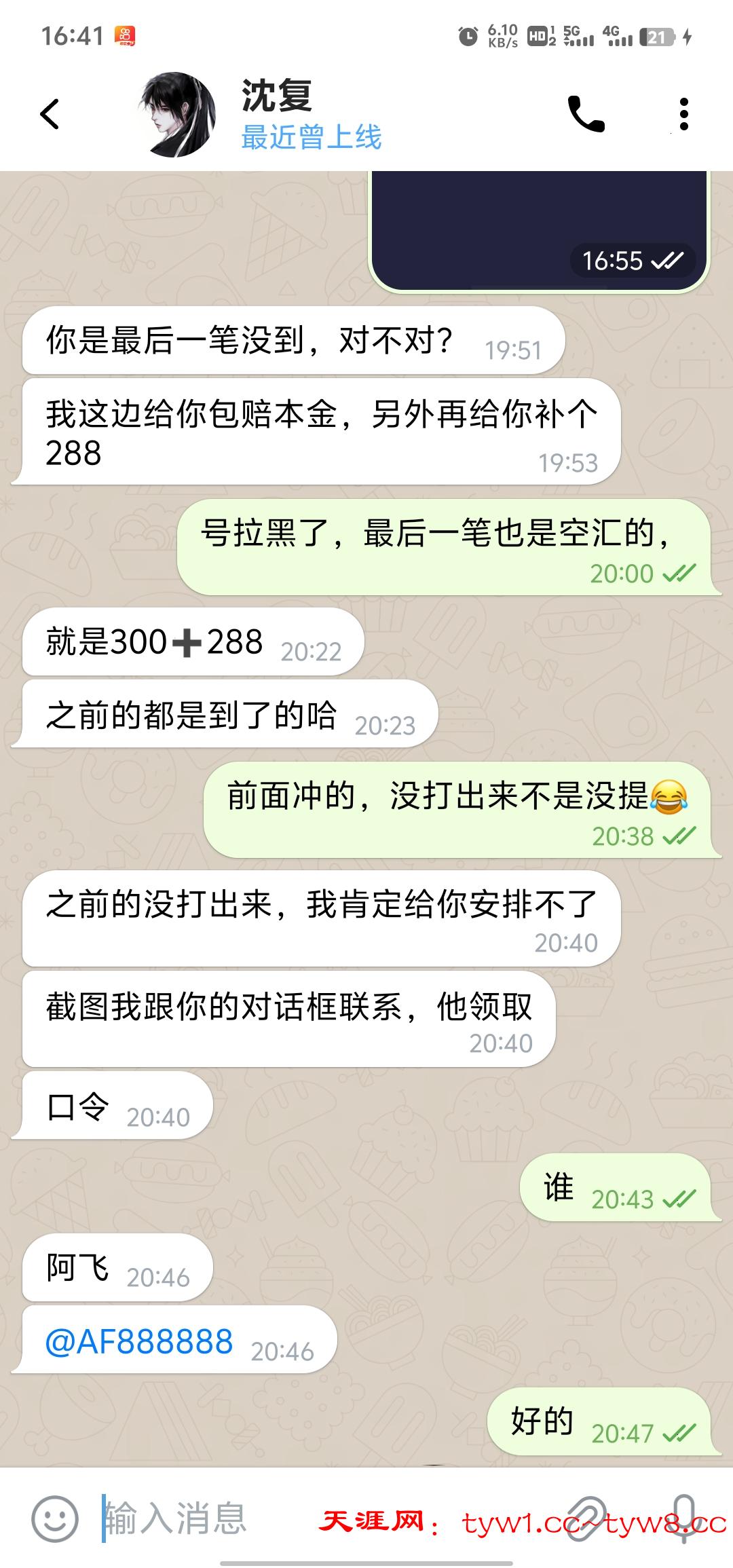 天涯论坛稳的一逼,之前1号玩的海王国际,充了一百,3号冲了200,5号充了300上到了2500多,提现卡了6小时,我就找沈复处理问题,如果黑款,他们兜底,我以为吹牛逼,我就草草回应了,6号我上海王国际,已经进24小时卡款了,页面跳了个提示正常出款,我以为到账了,我就看钱包,没有,在回到海王号就拉黑了,我再次找到沈复,反应问题,给了300+288的补偿,,今天已经到账,很舒服,晚上又能洗脚了