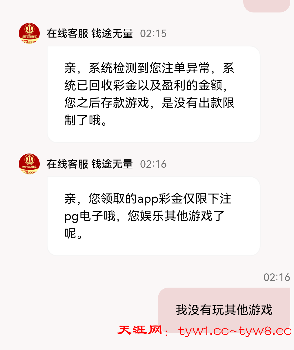 我领取的时候跟我说没什么要求,下款就说玩了别的游戏,我只在打电子。注意回避