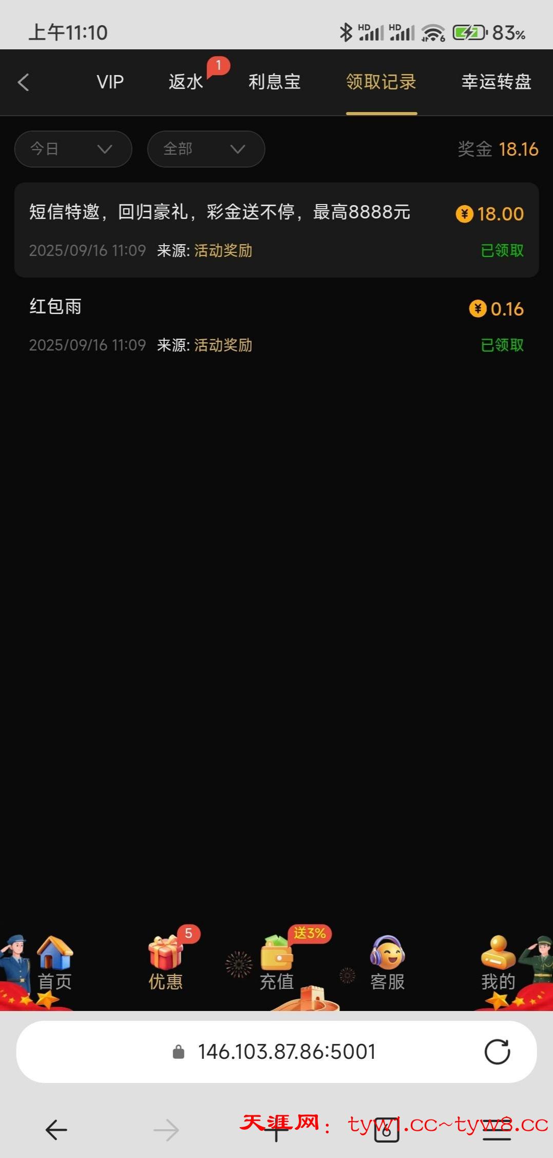 之前是特邀短信自助送9现在又出了一个短信回归之前领过9的估计这个也可以领1238.cc