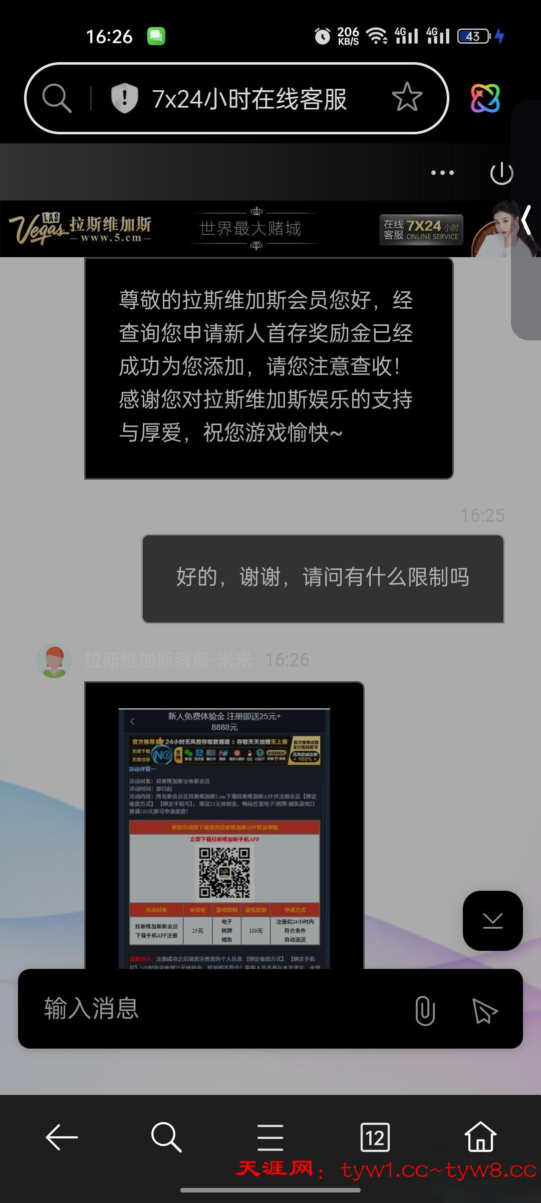 拉斯维加斯复活 下午的时候看想到之前老哥发贴,我没赶上,黄了没送,然后又重新注册了一个账号,找客服10分钟的样子就送了注意第一次只能提卡提卡提卡网址 5001.com
