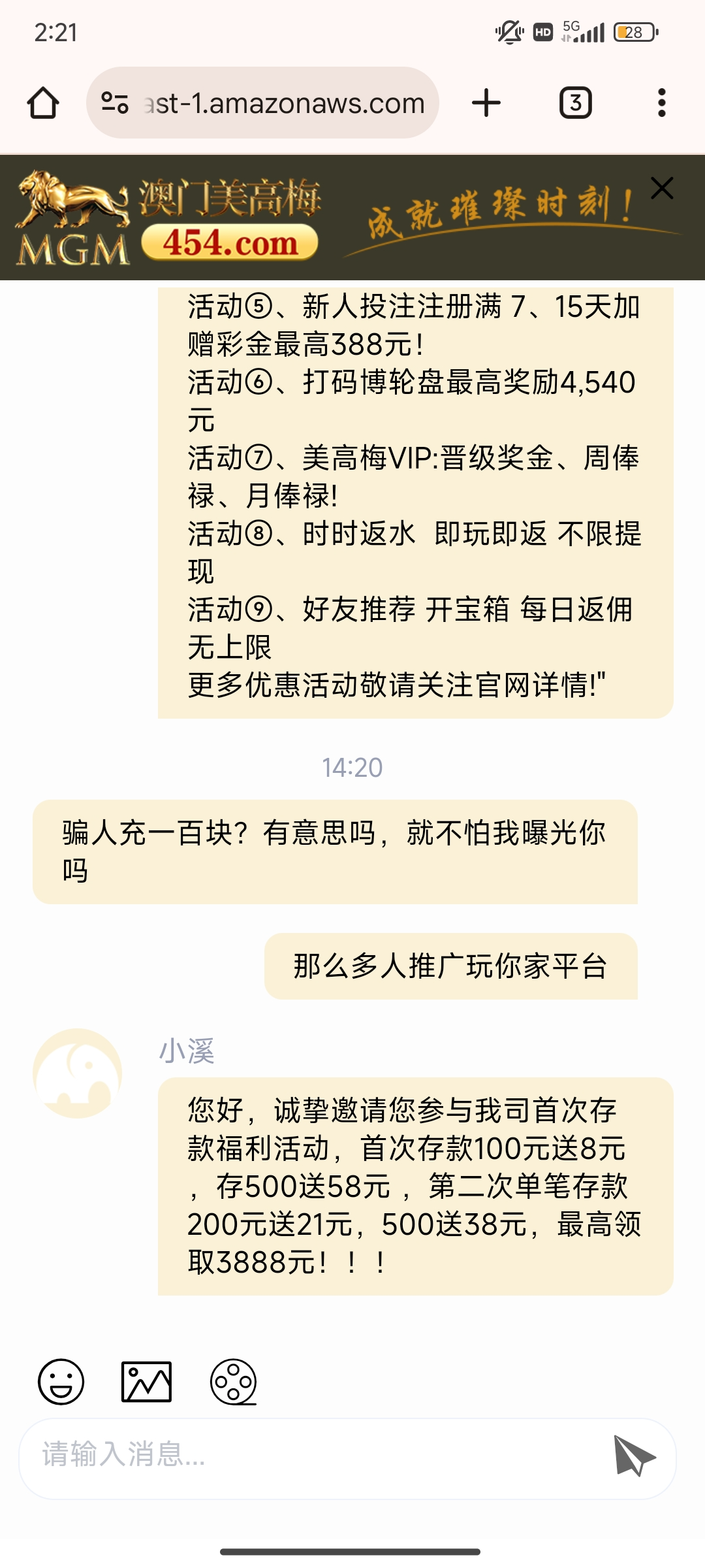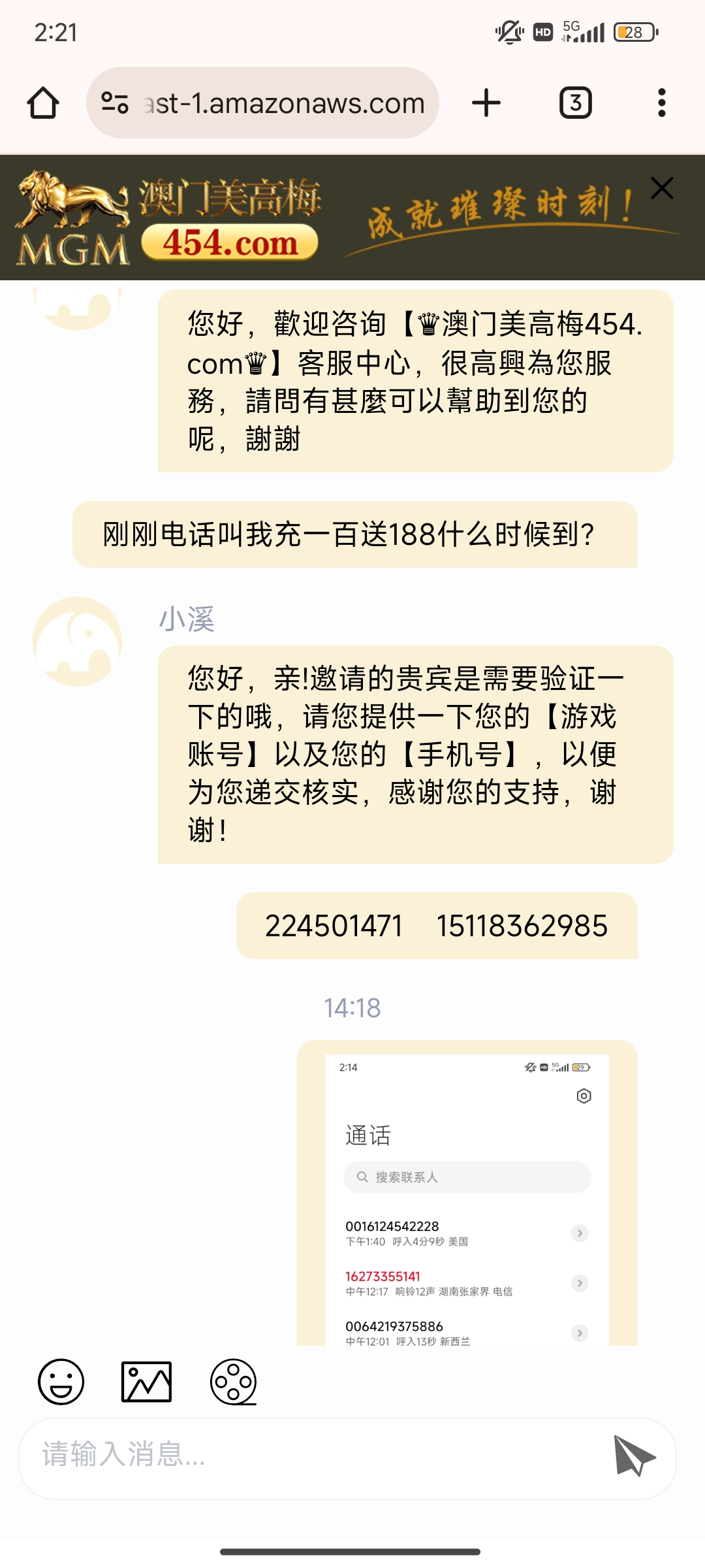 454美高梅 黑平台,电话打来一边叫充值100送188充值了才挂电话的,说送又没送,客服直接装死