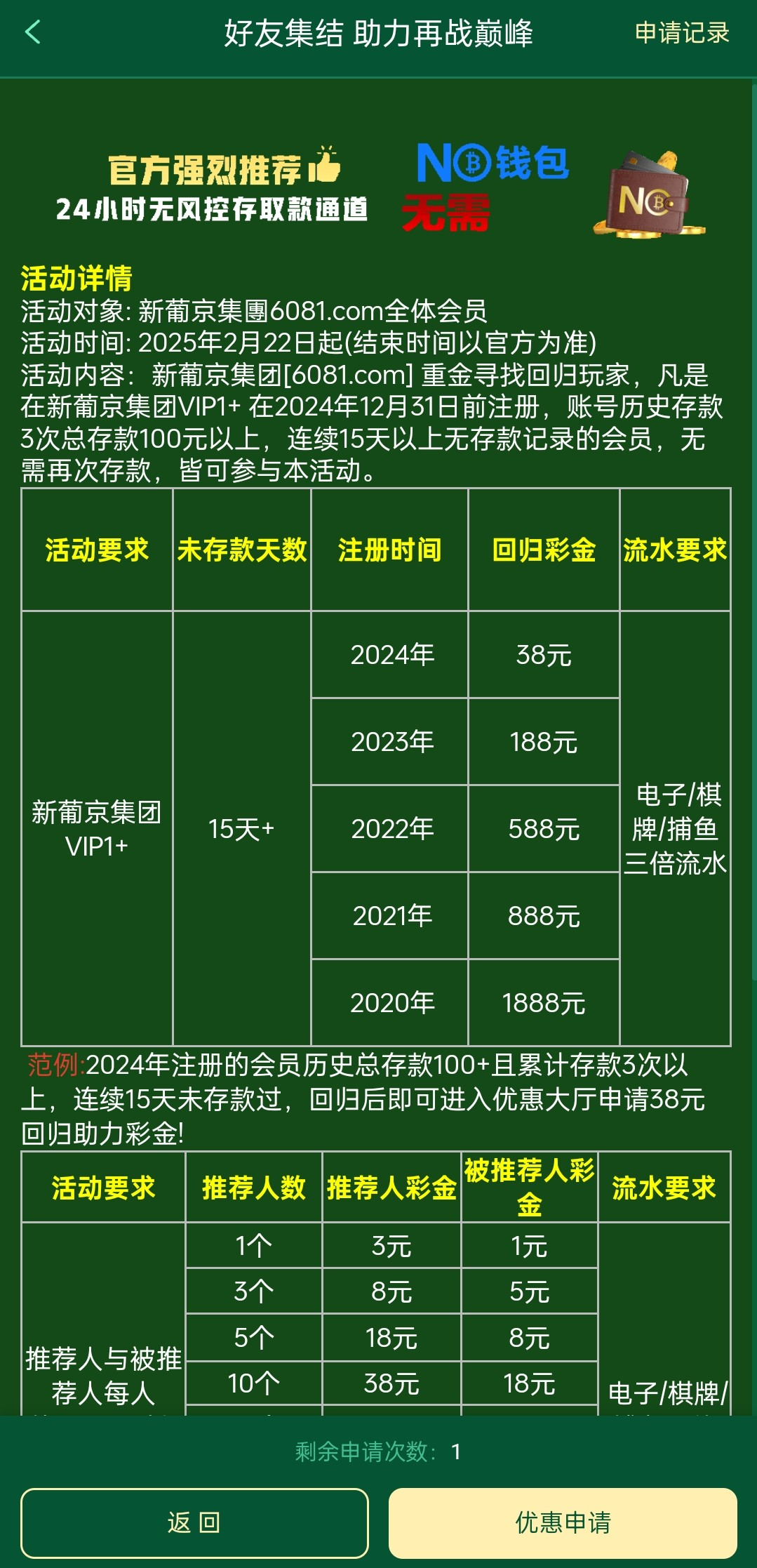 VIP1未存款15天加可以领取彩金38,玩过不知道的可以去领取一下 新葡京081.com