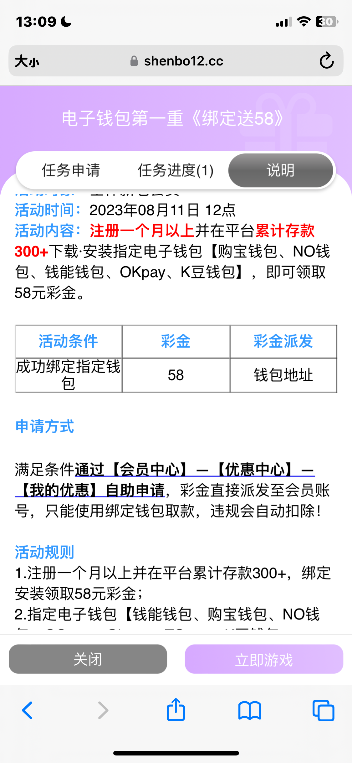 注册一个月以上,充值300+的可以去优惠自助申请58钱包绑定彩金!