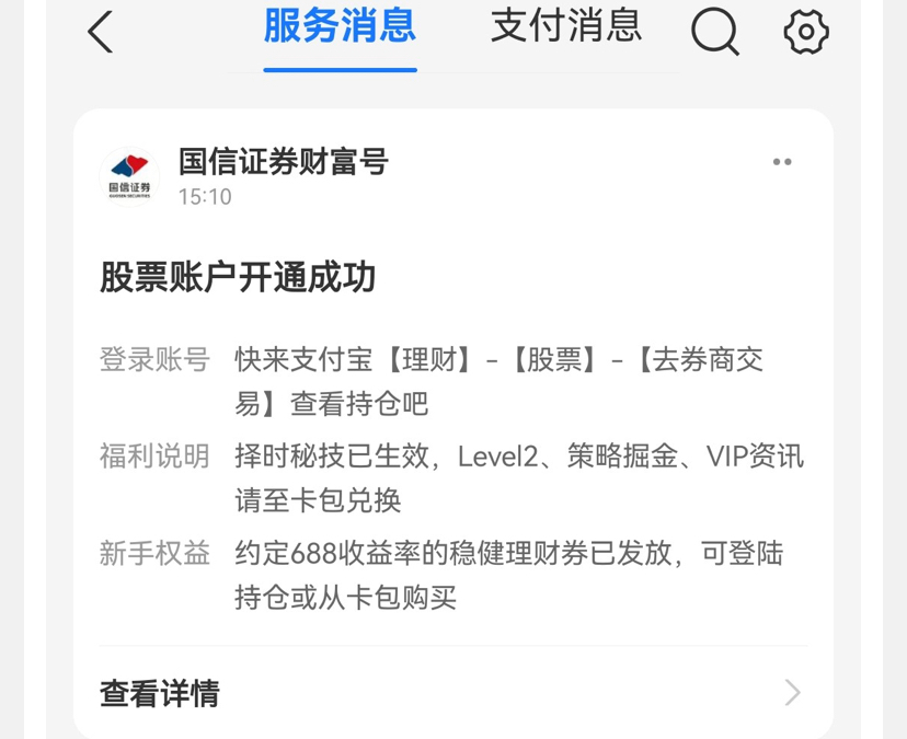支付宝股票开户送30元无门槛抵扣劵之前没开户成功的老哥可以现在去试试,开户和审核我五分钟就搞定了,需要有中国银行卡,还能正常使用的。看图一操作 我是亲测弄到了才发的