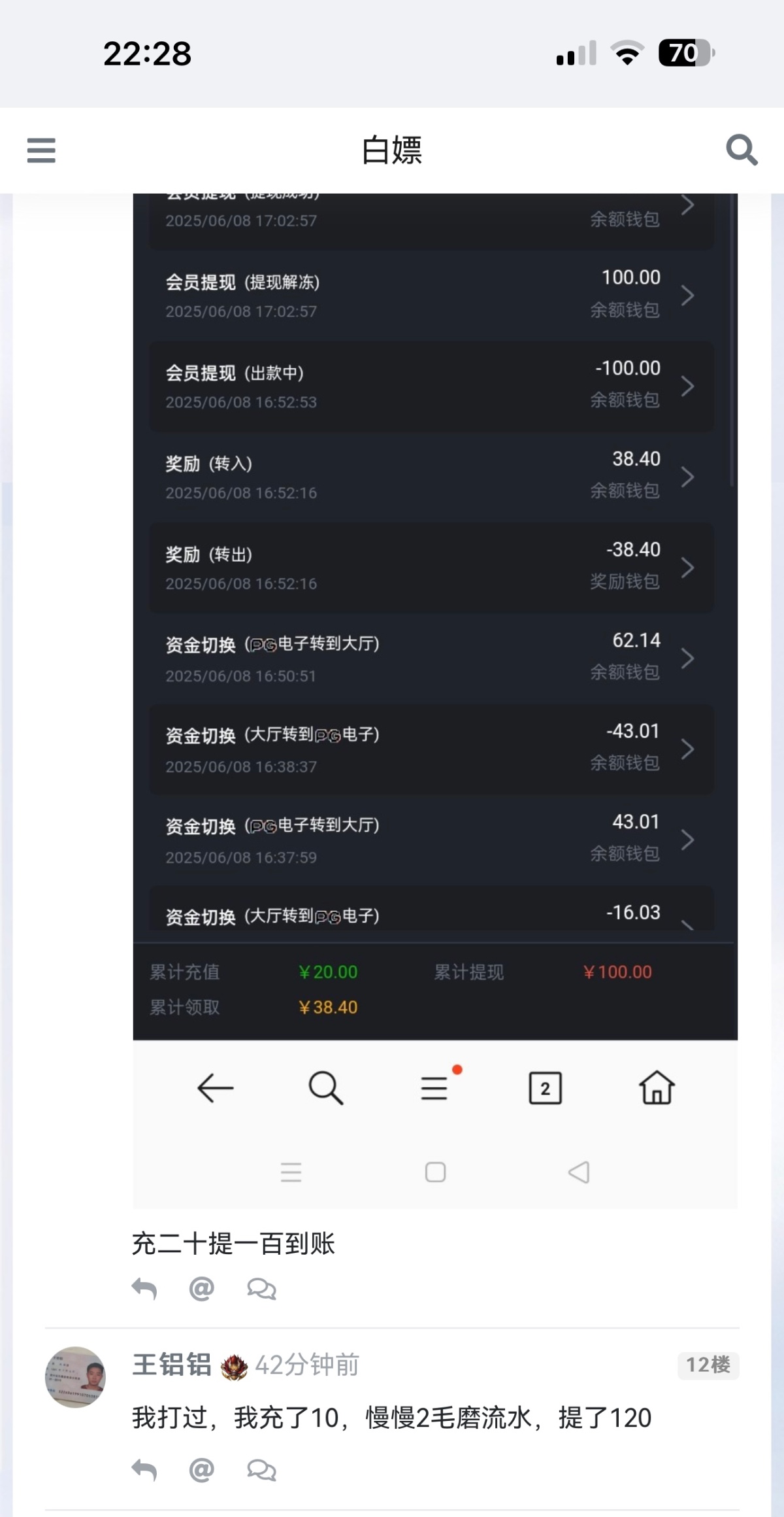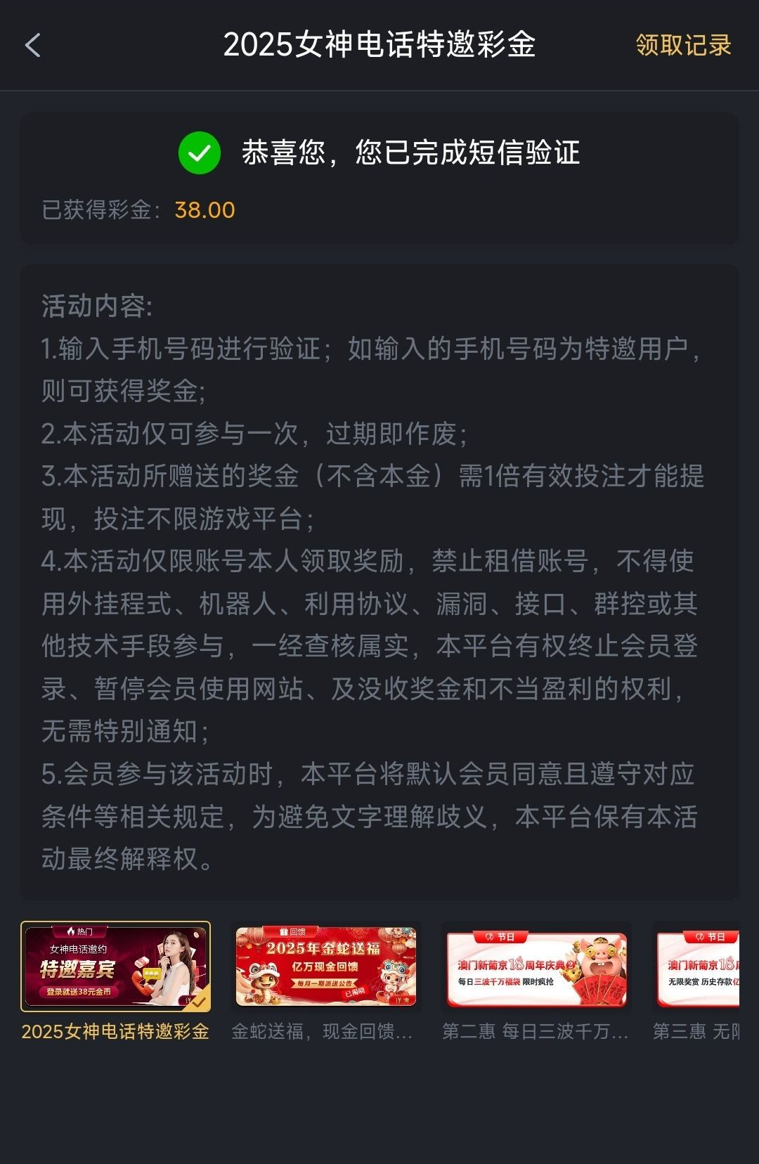 真黑这个台子,想要领取这个彩金,充值多少就要打多少的流水然后再加38的流水。意思就是冲40就要打40+38的也就是78流水,冲10就是打10+38也就是48流水。