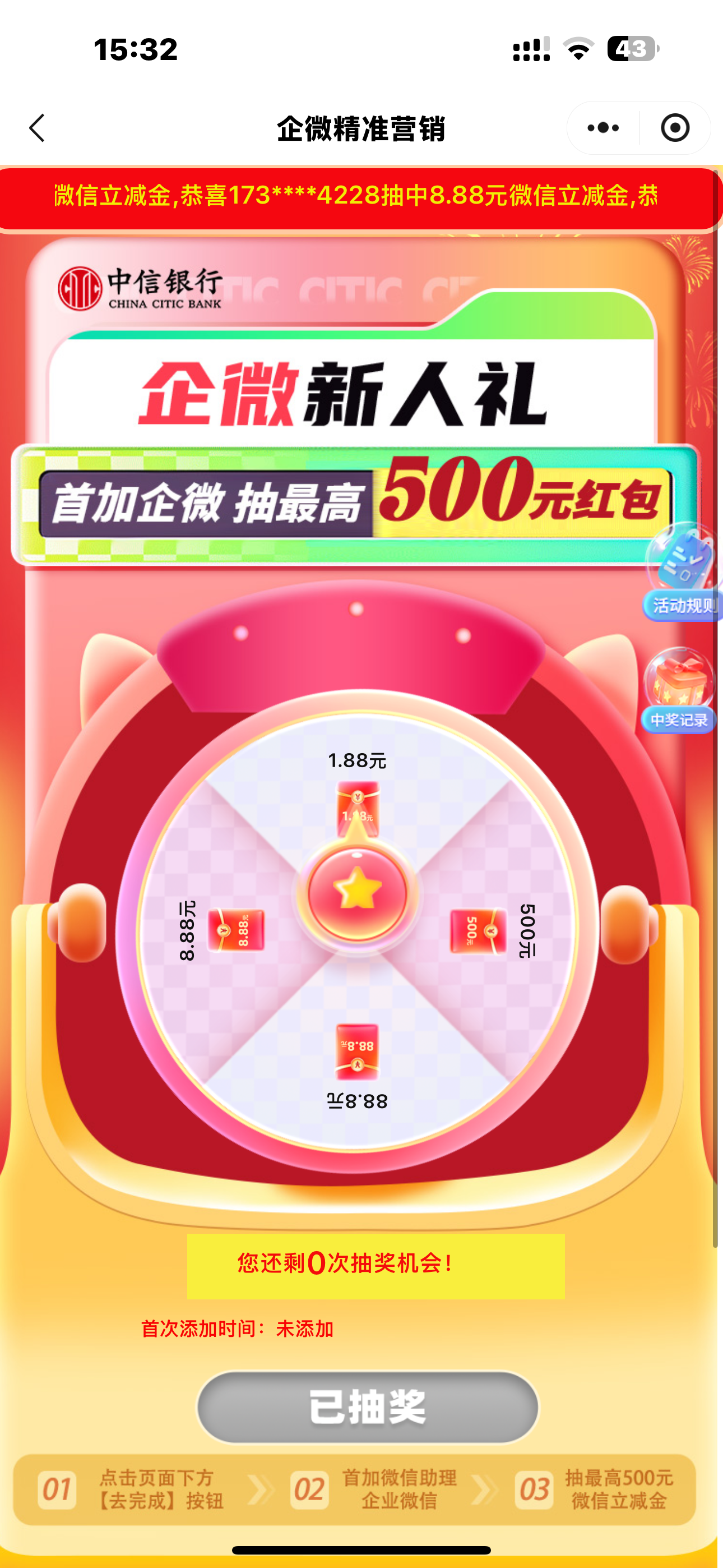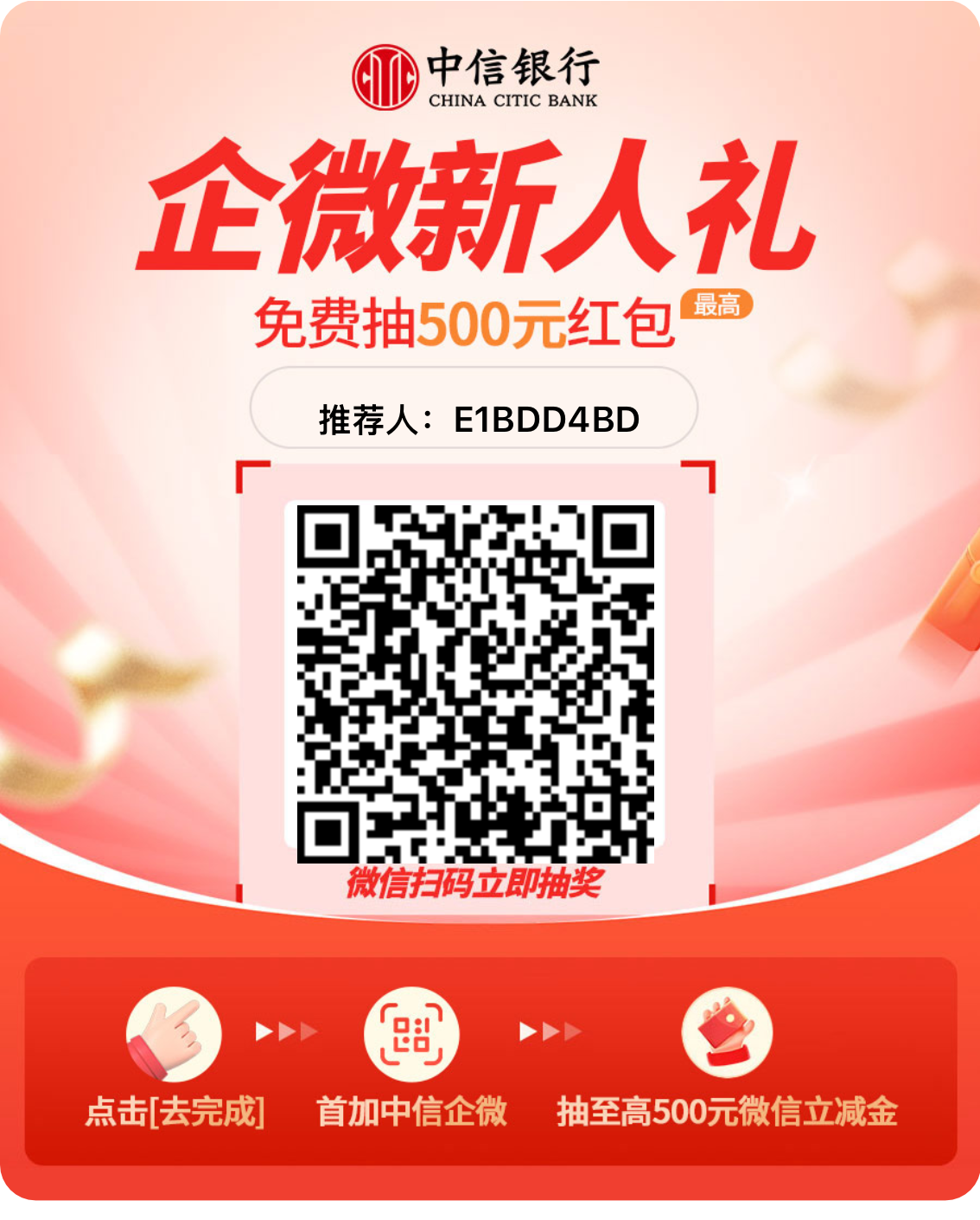有中信银行的微信扫码,然后有微信小号的也可以继续抽,微信号多无限抽