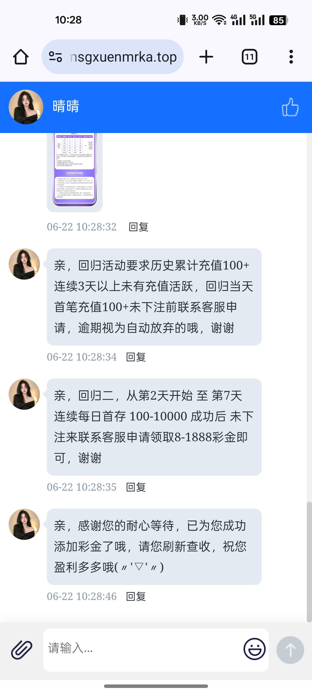 联系在线客服发手机号领取回访彩金,我送了8,还有回归充值活动100+88,自测