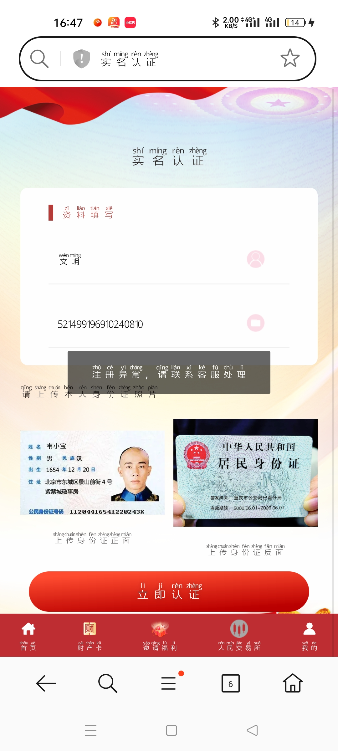 第三步,实名认证,名字是自己的就行,身份证号码,身份证正反面随便上传都可以
