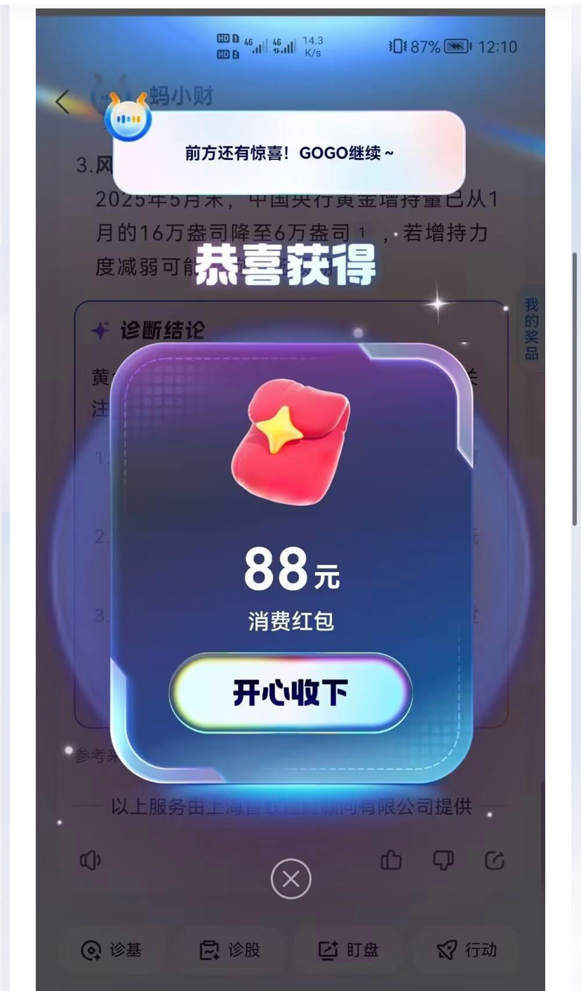 支付宝搜索蚂小财 跟着任务走 大概率中88消费红包 自测